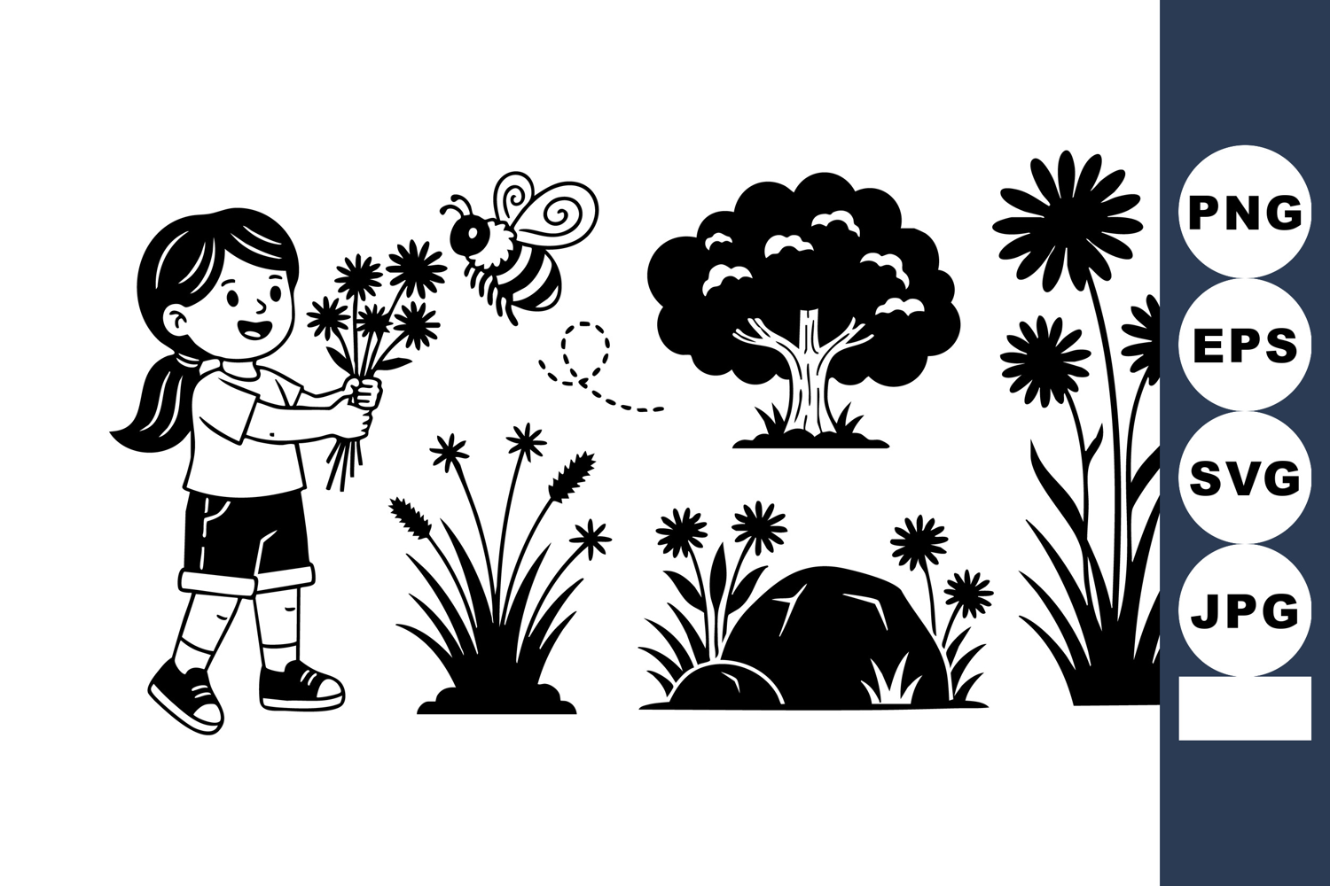 Cheerful black and white cartoon landscape shows a happy girl gathering wildflowers while a bee flies near stylized tree, rocks, and tall grass, ideal for children’s coloring pages or educational worksheets, playful.