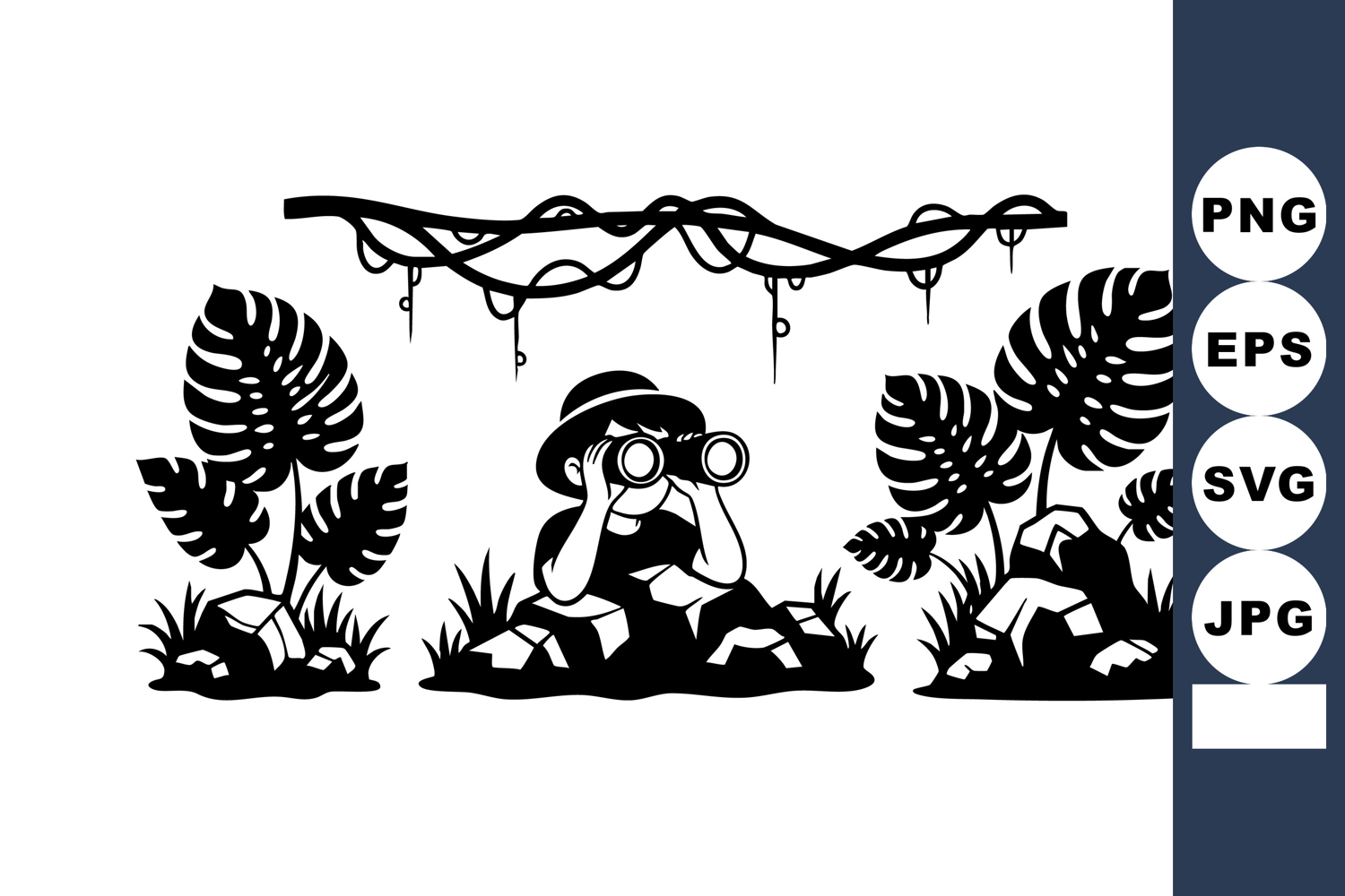 A young jungle explorer peers through binoculars between bold tropical plants and rocks in black silhouette vector art, ideal for children education projects, posters, and playful adventure branding graphics, curious.