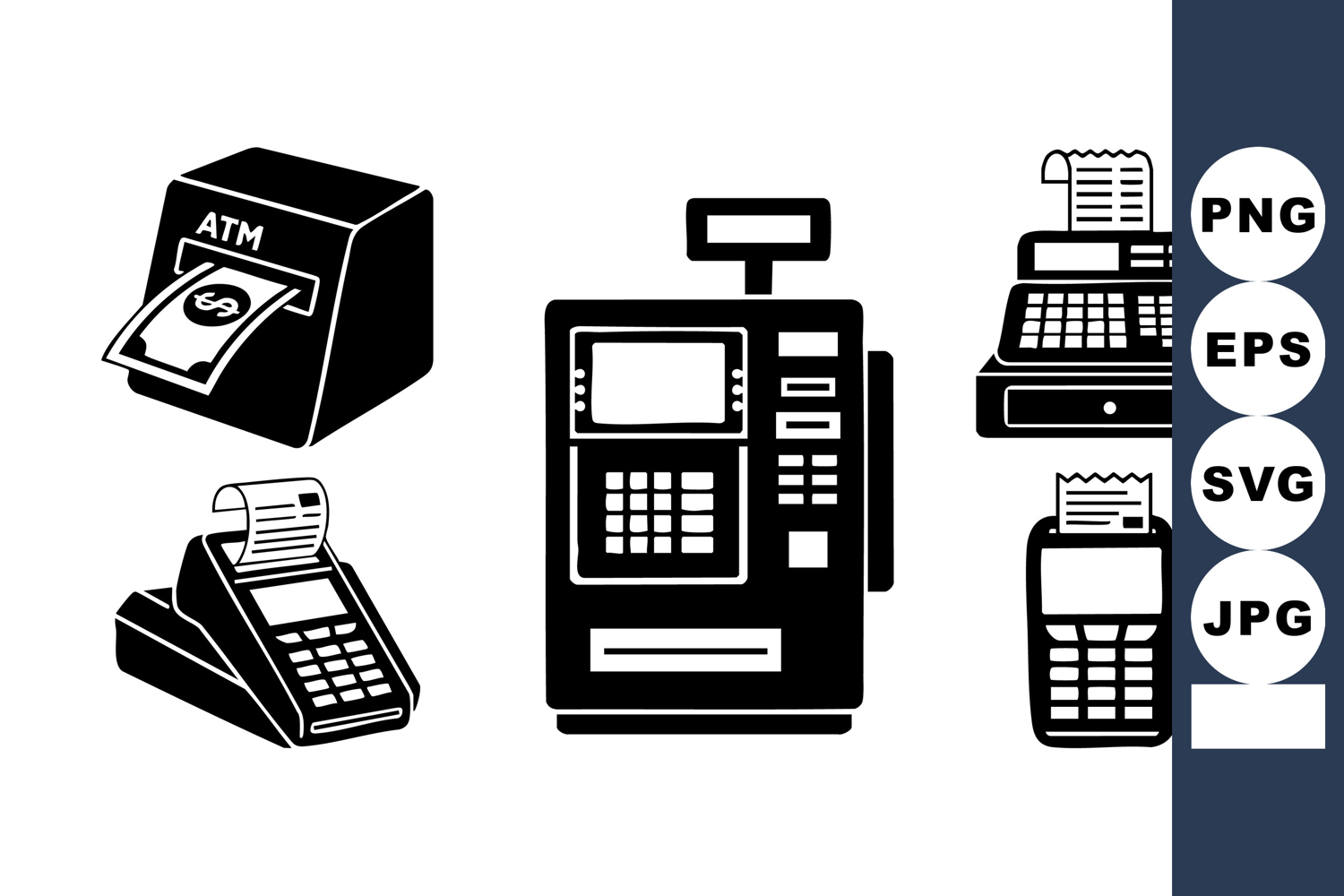 Flat Black Money Terminal Icon Set - ATM POS Register example image 1