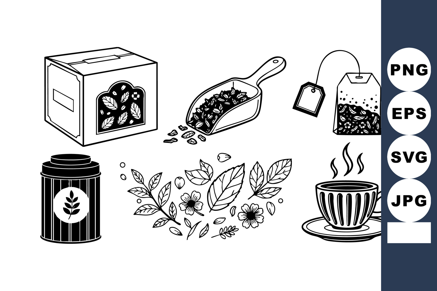 Black Line Art Assorted Tea Elements Vector Set example image 1