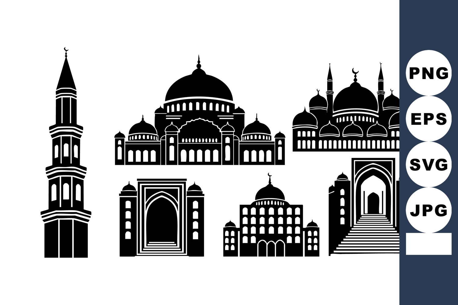 Minimal Mosque Silhouettes Islamic Architecture Vector Black Mosque Clipart Ramadan Mosque Graphics Eid Mosque Decoration Ornate Gateway Illustration Grand Arch Staircase Crescent Moon Minarets Spiritual Skyline Design Elegant Mosque Design
