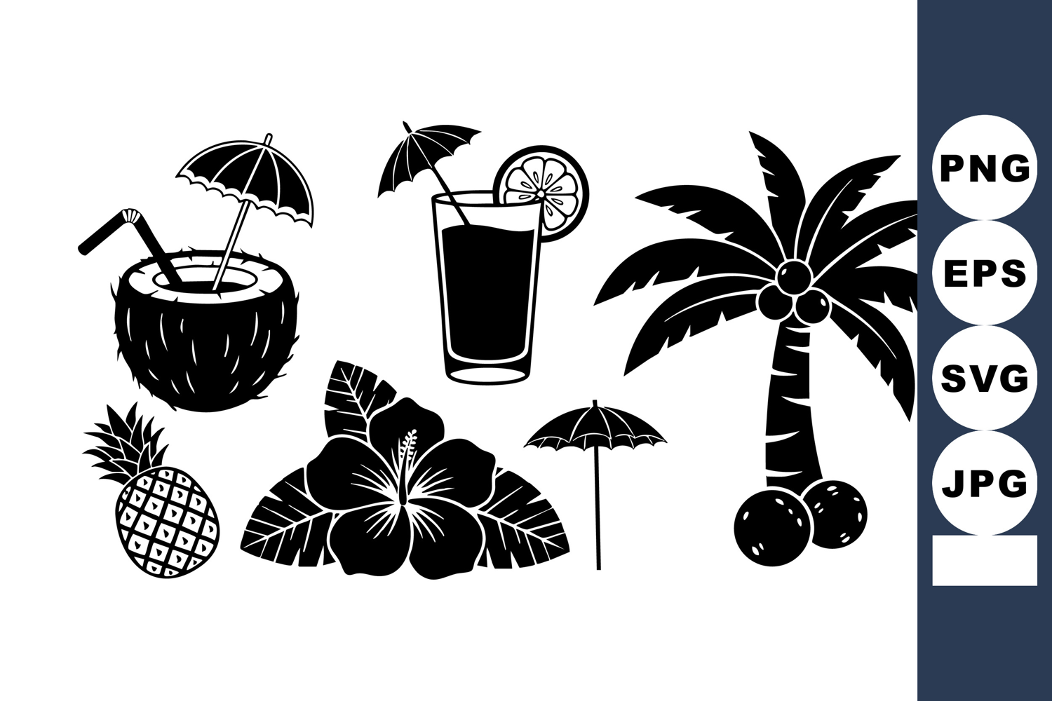 Group of bold black tropical silhouettes includes coconut drink, cocktail glass, palm tree, pineapple, umbrellas, and hibiscus flower, created as flat vector art for summer posters, branding, and invitations, cheerful.