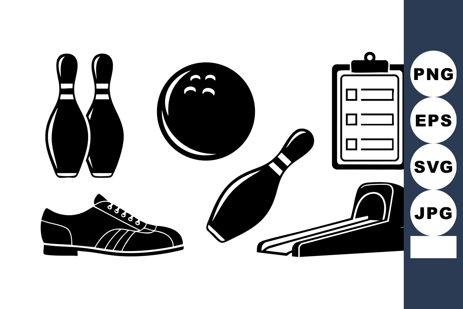 Bold black silhouette icons display bowling ball, pins, shoe, scoring clipboard, and lane ramp in flat design style, ideal for sports infographics, web graphics, or team logo layouts, energetic.