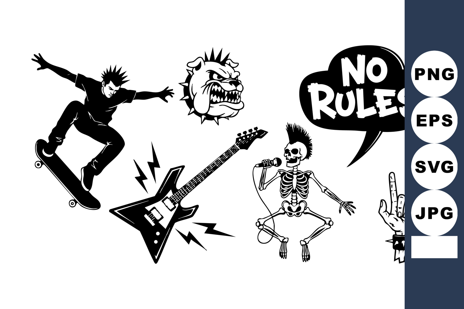 Electric Guitar Illustration Punk Skateboard Flash No Rules Artwork Angry Bulldog Mascot Skeleton Punk Singer Street Skate Design Punk Rock Collage Rebellious Youth Graphic Bold Monochrome Vector Tattoo Style Stickers