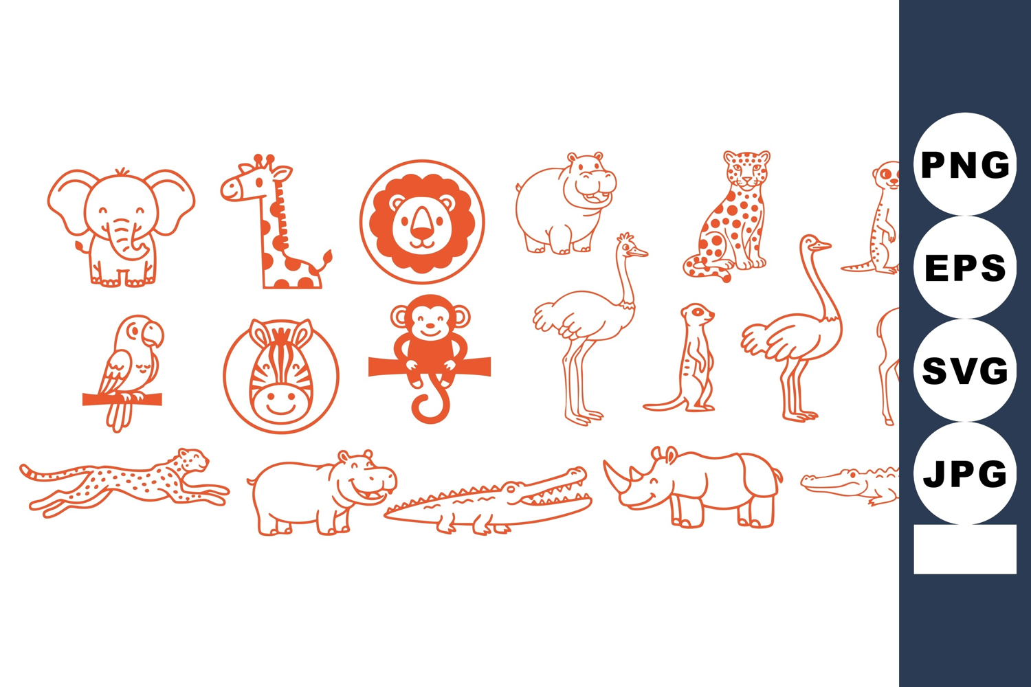 Kids Poster Design Flat Line Art Safari Animal Vector Cute Animal Icons Warm Cream Background Orange Safari Animals Playful Horizontal Banner Children Educational Graphics Minimal Line Illustration Flashcard Learning Set