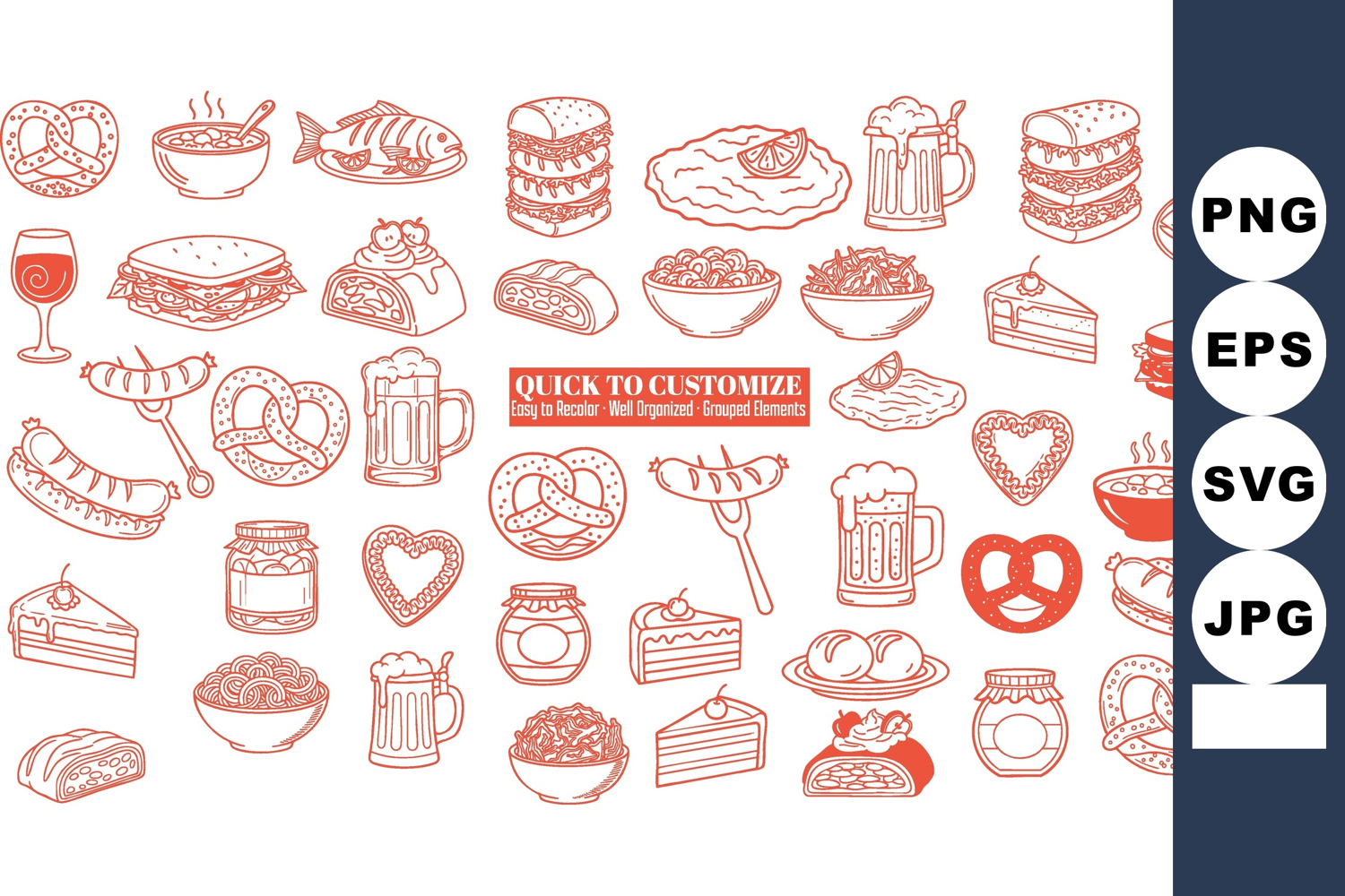 Restaurant Menu Graphics Hand Drawn Food Seamless Food Pattern Playful Food Icons Red Line Art Oktoberfest Food Clipart Beer Pretzel Sausage Cute Snack Doodles Vector Food Collection Menu Packaging Branding