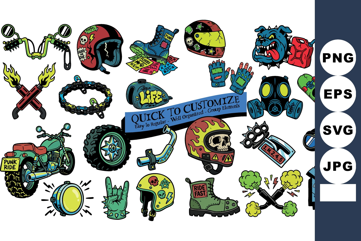 Energetic skate punk vector flash collection presents skull helmets, motorcycles, gloves, boots, chains and rebellious badges in bold cartoon style, ideal for apparel prints, sticker packs, or edgy poster graphics, vibrant.