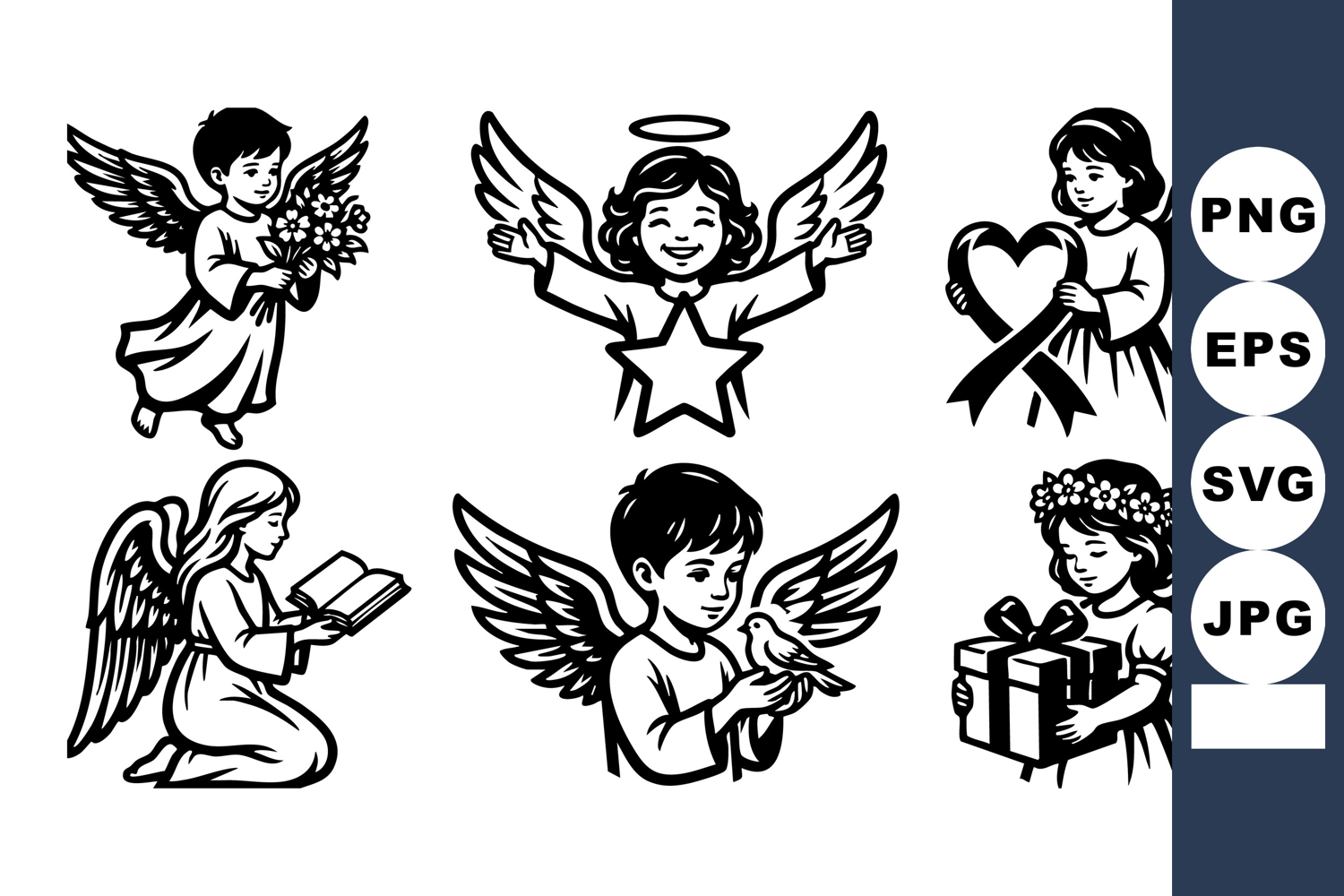Collection of six adorable child angels drawn in bold black line art, each holding symbolic objects like flowers, dove, book and gift, ideal for tattoo flash, stickers or greeting cards, peaceful.