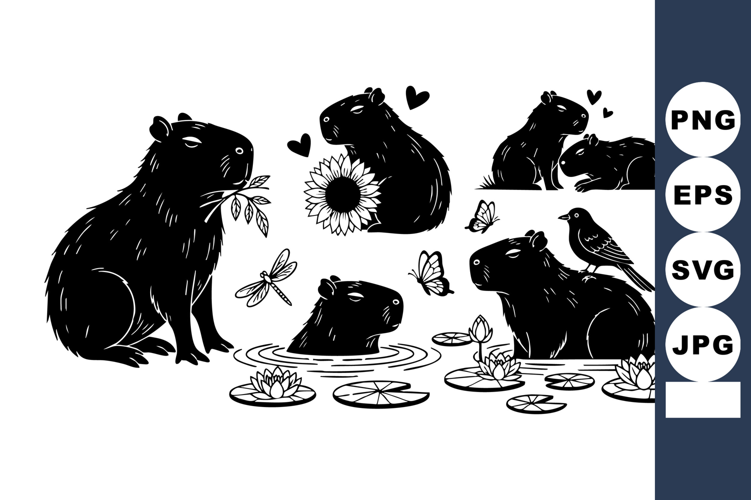 Cute Capybara Silhouette Capybara Silhouette Vector Flat Design Capybara Capybara Sunflower Pond Lotus Pond Capybara Capybara Butterfly Pond Capybara Dragonfly Pond Capybara Bird Pond Capybara Family Sitting Monochrome Capybara Illustration
