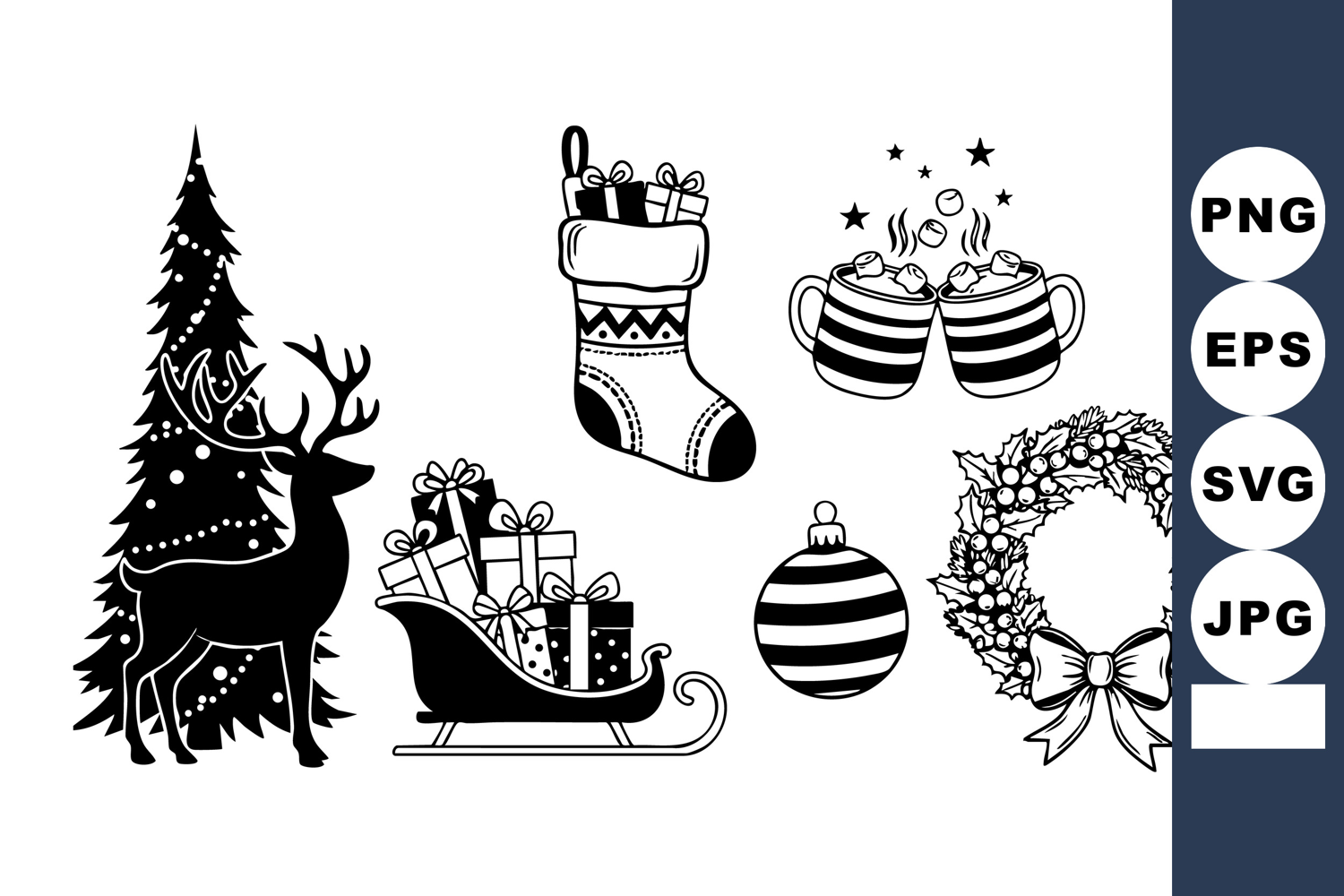 Black And White Christmas Vector Set Line Art Christmas Stocking With Gifts Reindeer Beside Tree Sleigh Of Gifts Striped Cocoa Mugs Holly Wreath Bow Cozy Warm Mug Coloring Page Vector