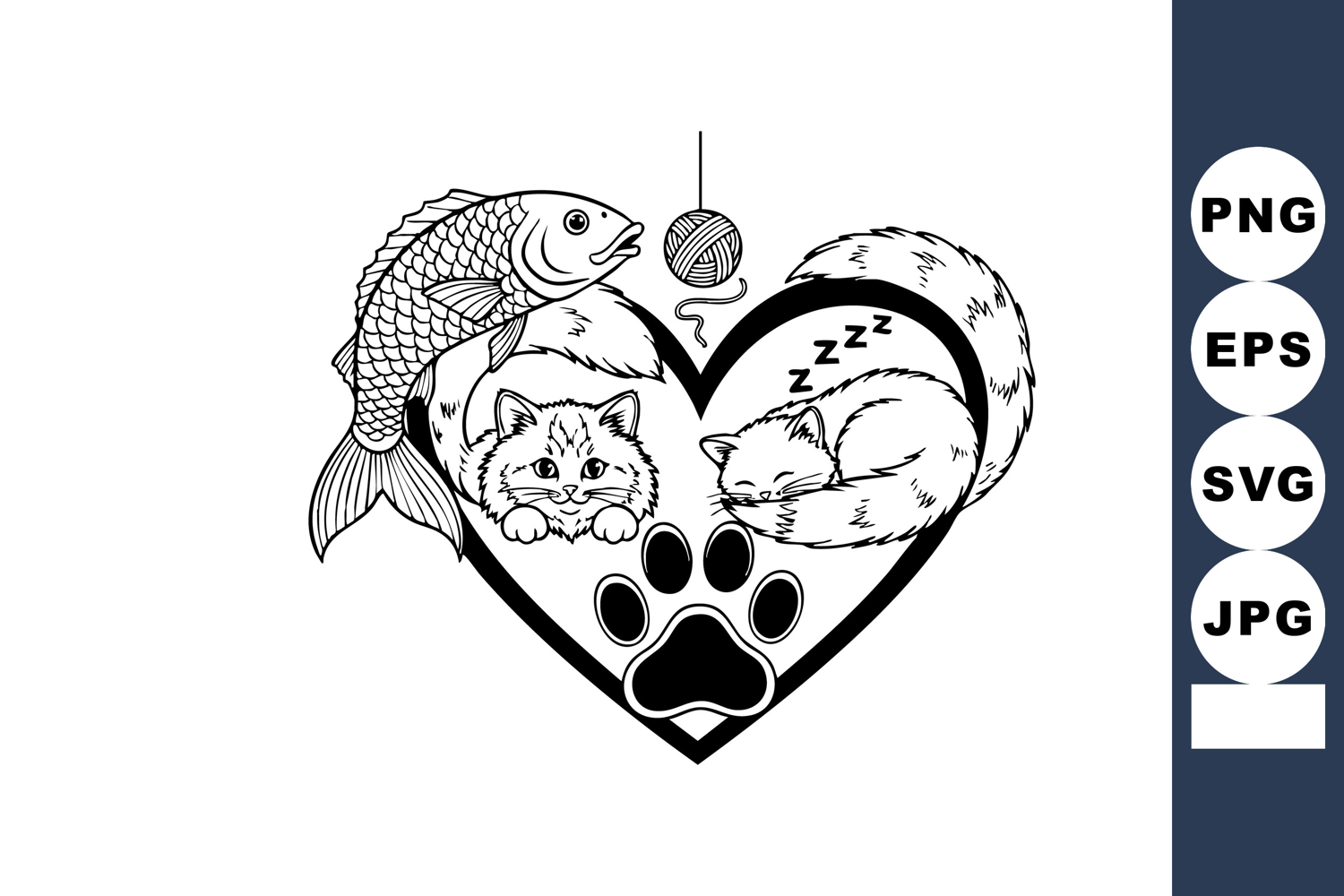 Koi Fish Design Yarn Ball Clipart Heart Frame Cats Sleeping Cat Illustration Awake Cat Drawing Pet Paw Emblem Playful Pet Design Cute Feline Art Cat Lover Emblem Vector Pet Illustration