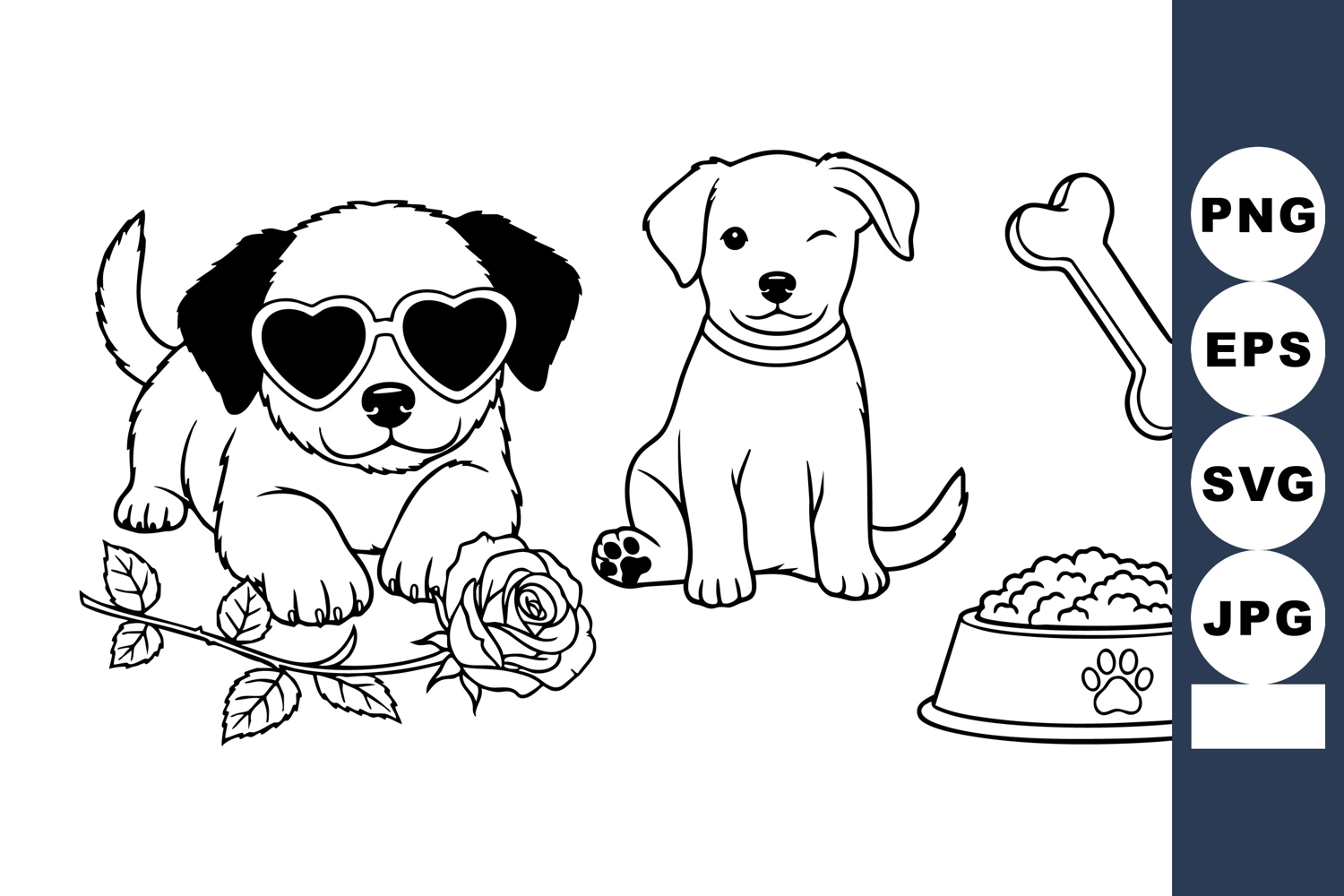 Adorable puppy coloring sheet presents fluffy dog wearing heart sunglasses beside rose, with winking puppy, bone and full food bowl in simple cartoon line art, ideal for kids activities, sweet.