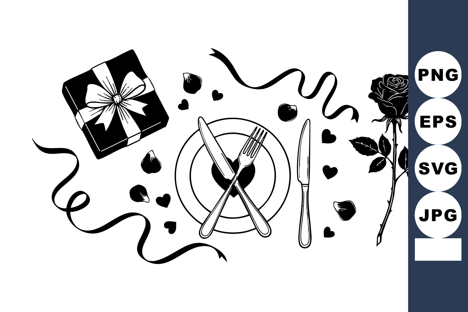 Elegant black and white line art arranges a romantic dinner plate, crossed cutlery, gift box, ribbon and rose, ideal for valentine’s day invitations, restaurant menus or greeting card layouts, charming mood