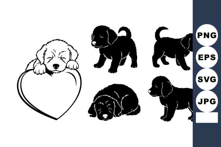 Adorable golden retriever puppy silhouettes appear in multiple poses, including a sleeping dog resting over a heart outline, rendered as clean black and white vector art for cards, stickers, and pet branding, sweet.