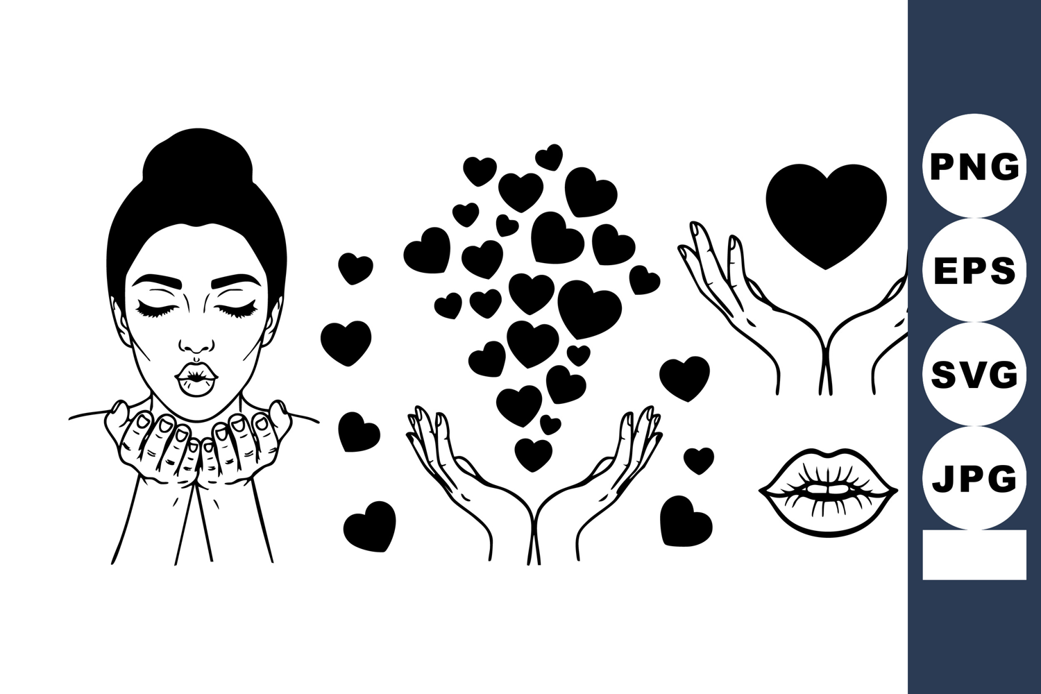 Line Art Portrait Minimal Valentine Design Black White Vector Woman Blowing Kiss Open Hands Holding Cupped Hands Holding Floating Hearts Motif Lips Kiss Icon Heart Symbol Outline Romance Branding Elements