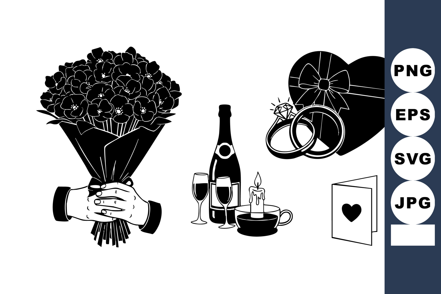 Elegant monochrome flat design groups bouquet, champagne bottle with glasses, engagement rings, heart gift box, candle and greeting card, ideal for valentine’s day invitations, wedding stationery, romantic branding, sentimental mood