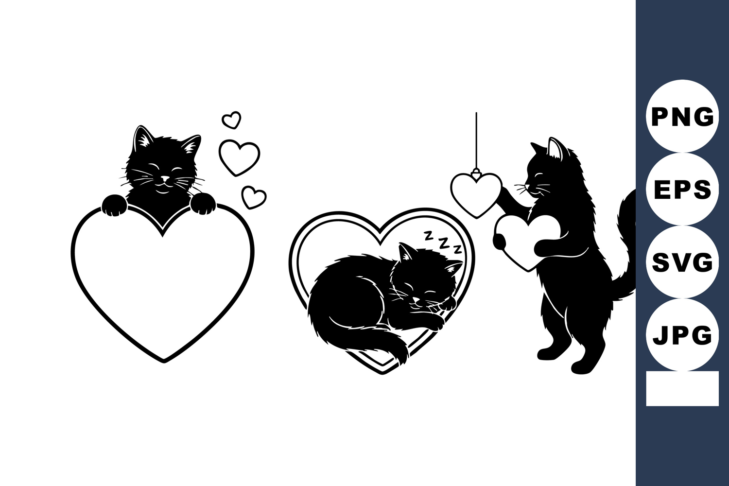Three black cat silhouettes interact with heart frames and valentine ornaments in a clean flat design style, ideal for greeting cards, stickers, pet-themed decor, and romantic holiday stationery, charming.