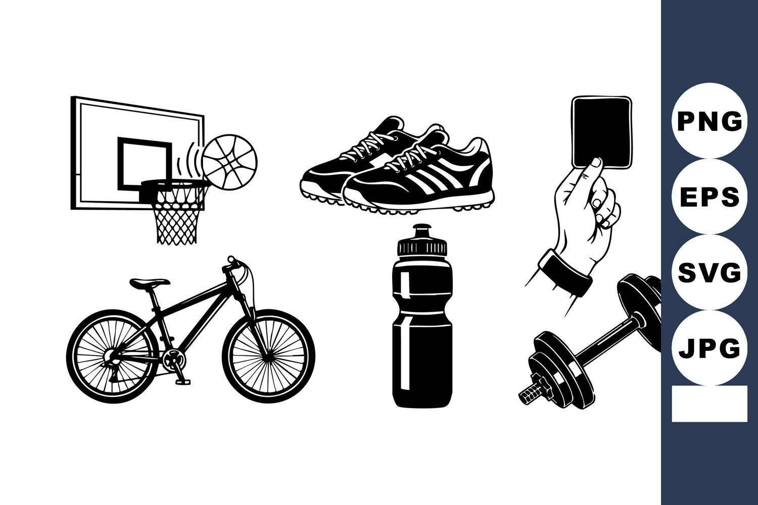 Flat Design Icons Running Shoes Icon Water Bottle Icon Bicycle Vector Icon Monochrome Sports Icons Basketball Hoop Icon Dumbbell Weight Icon Referee Hand Card Minimal Graphic Style Team Branding Icons