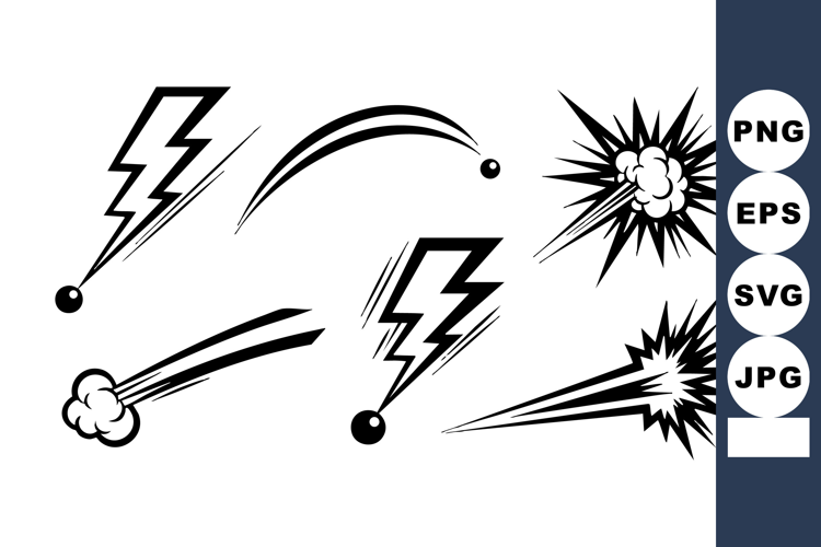 Comic Speed Lines Black White Vector Manga Action Effects Lightning Bolt Icons Explosive Impact Bursts Dynamic Motion Elements Superhero Impact Graphics Radial Explosion Lines Cartoon Blast Shapes Bold Graphic Elements
