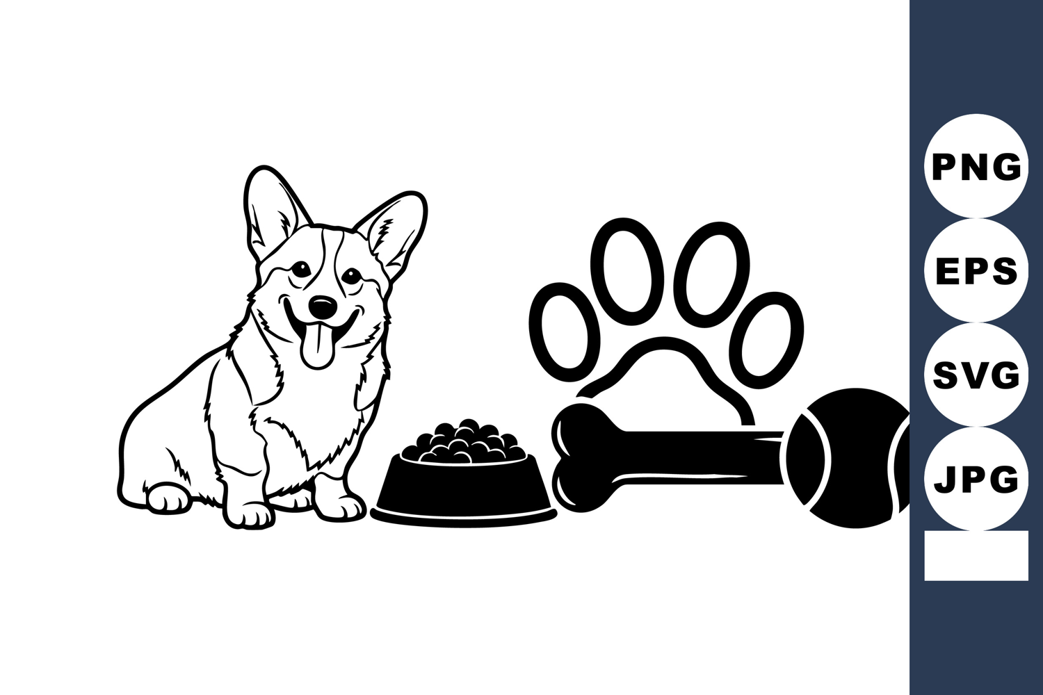Playful corgi line drawing sits happily beside a full food bowl, bold paw print, bone chew and tennis ball, ideal for pet branding, grooming logos, and veterinary graphics, cheerful.