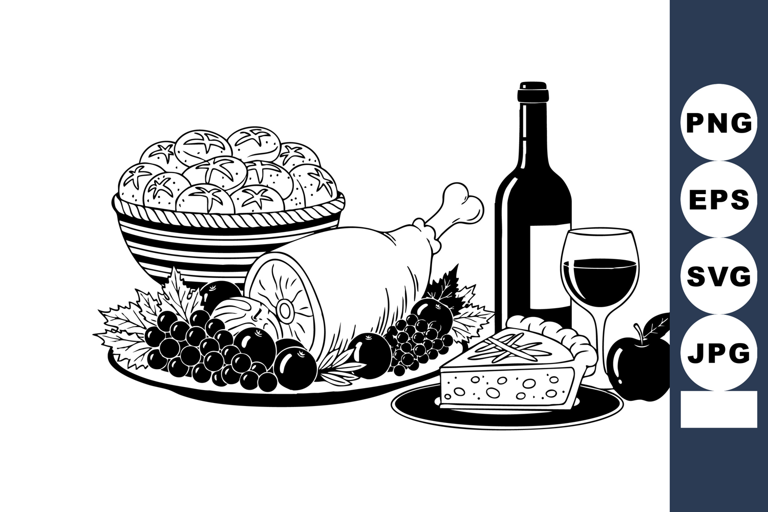 Black And White Wine Bottle Glass Flat Vector Art Holiday Menu Design Banquet Still Life Roasted Ham Illustration Grapes And Cherries Bread Rolls Bowl Pie Slice Plate Thanksgiving Dinner Feast