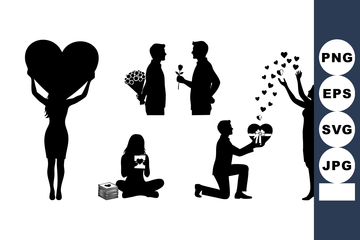 Multiple romantic silhouettes depict couples giving hearts, flowers, and gifts, including a kneeling proposal and a seated girl with love letters. Simple flat design suits Valentine’s Day cards, posters, and social media graphics, affectionate.