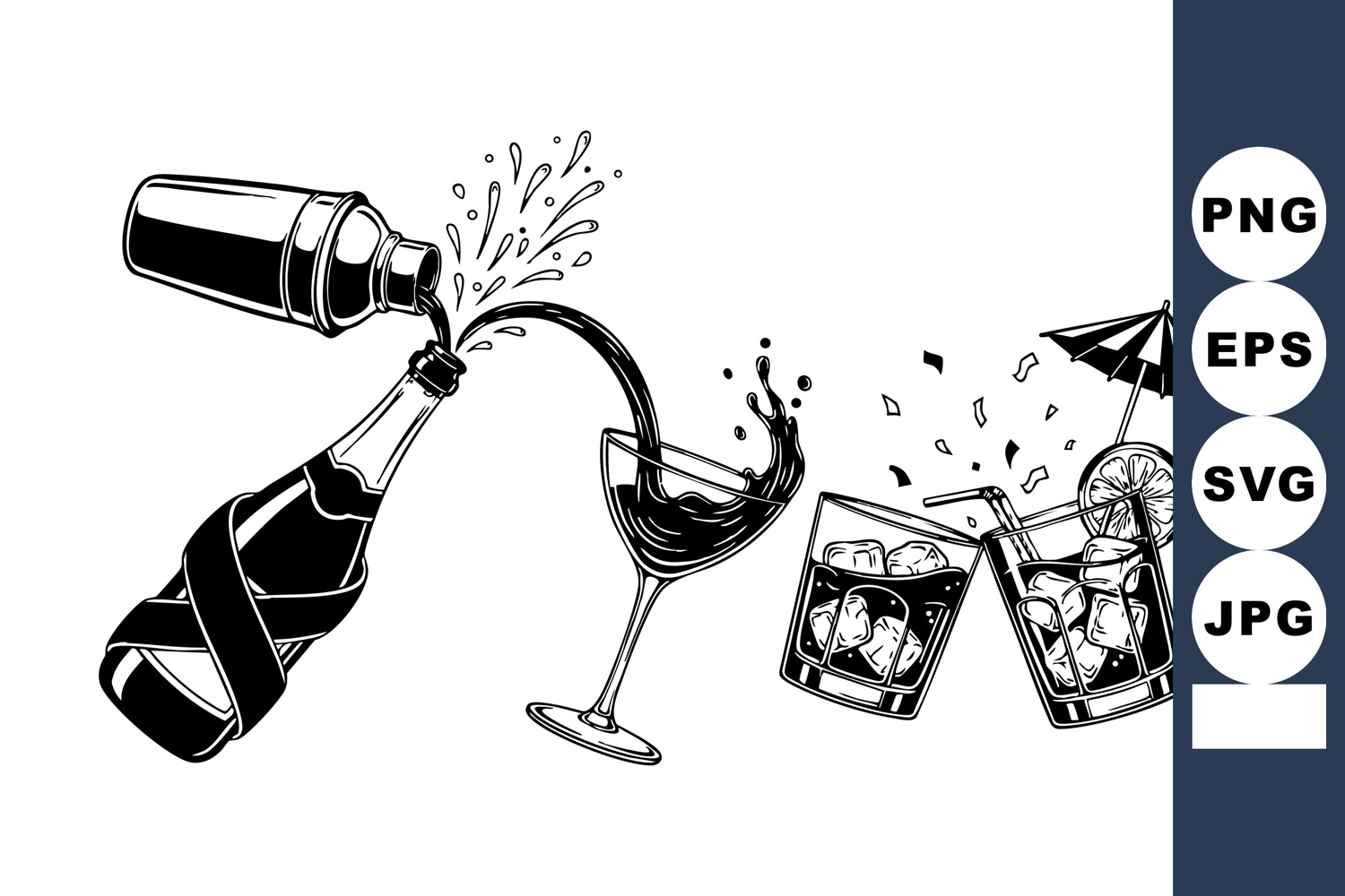Energetic black and white cocktail vector art presents champagne bottle, martini glass, shaker and tumblers with ice, straw and umbrella, ideal for bar menus, party invitations and celebratory branding, lively.