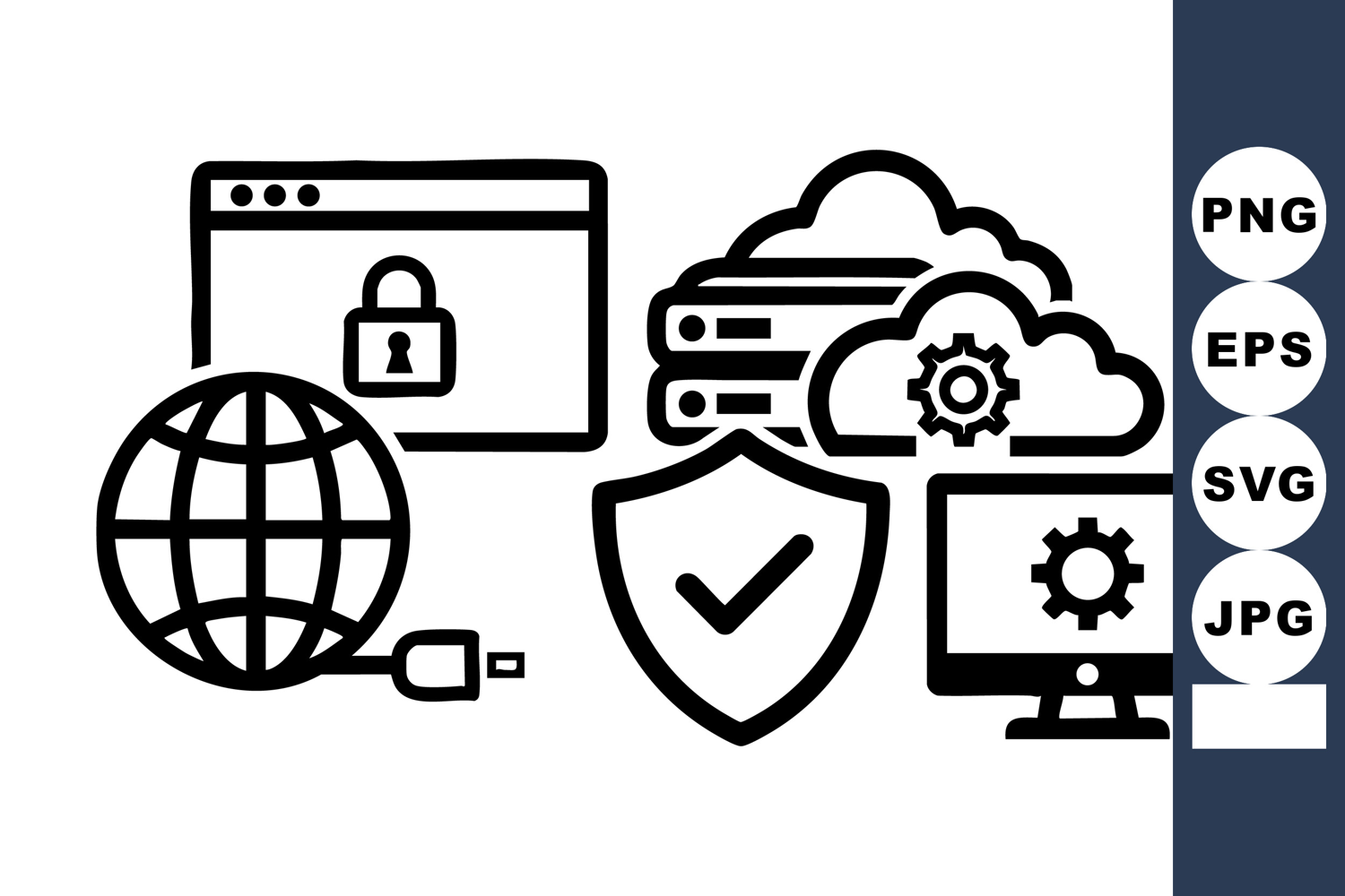 Minimal black line art graphic combines shield checkmark, browser padlock, cloud servers, globe, and desktop monitor icons, illustrating secure network infrastructure and data protection for web, app, and corporate branding projects, modern.