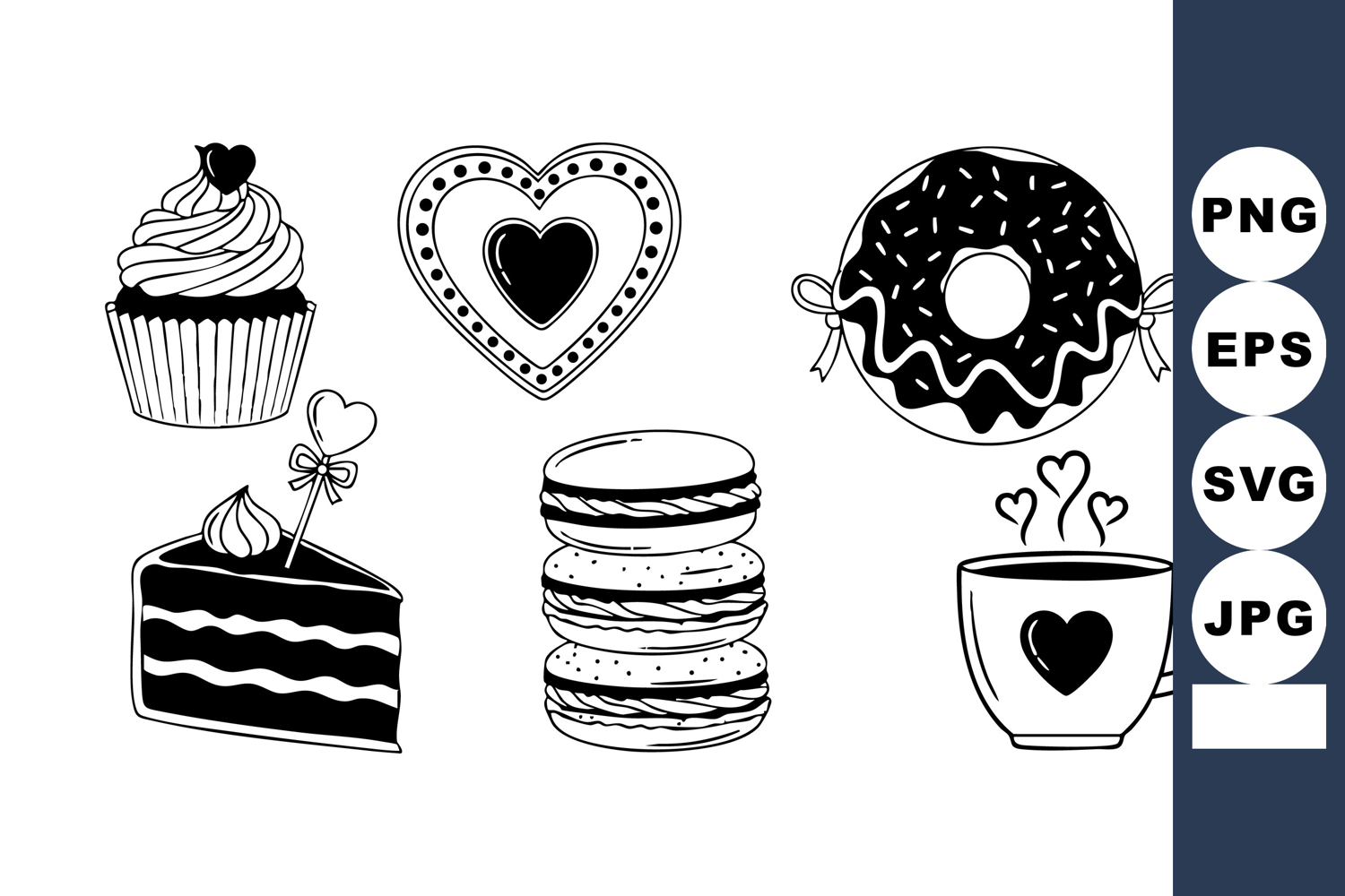 Hand Drawn Doodles Slice Of Cake Coffee Mug Hearts Steaming Coffee Mug Monochrome Line Art Cute Bakery Illustrations Valentine Dessert Set Cupcake Heart Cookie Sprinkled Donut Illustration Stacked Macarons Sketch