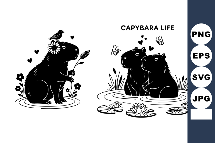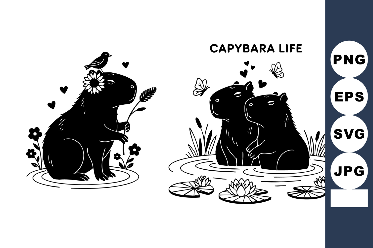 Kawaii Animal Clipart Lily Pond Scene Black Silhouette Art Capybara With Sunflower Loving Capybara Couple Capybara In Pond Sunflower Crown Capybara Bird On Capybara Flat Design Illustration Cute Children Decor