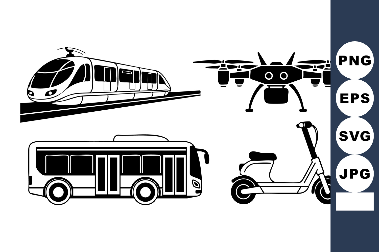 Minimalist black silhouette collection presents tram, quadcopter drone, urban bus and electric scooter in flat design, ideal for transport infographics, mobility apps, smart city presentations and sustainable travel projects, modern.