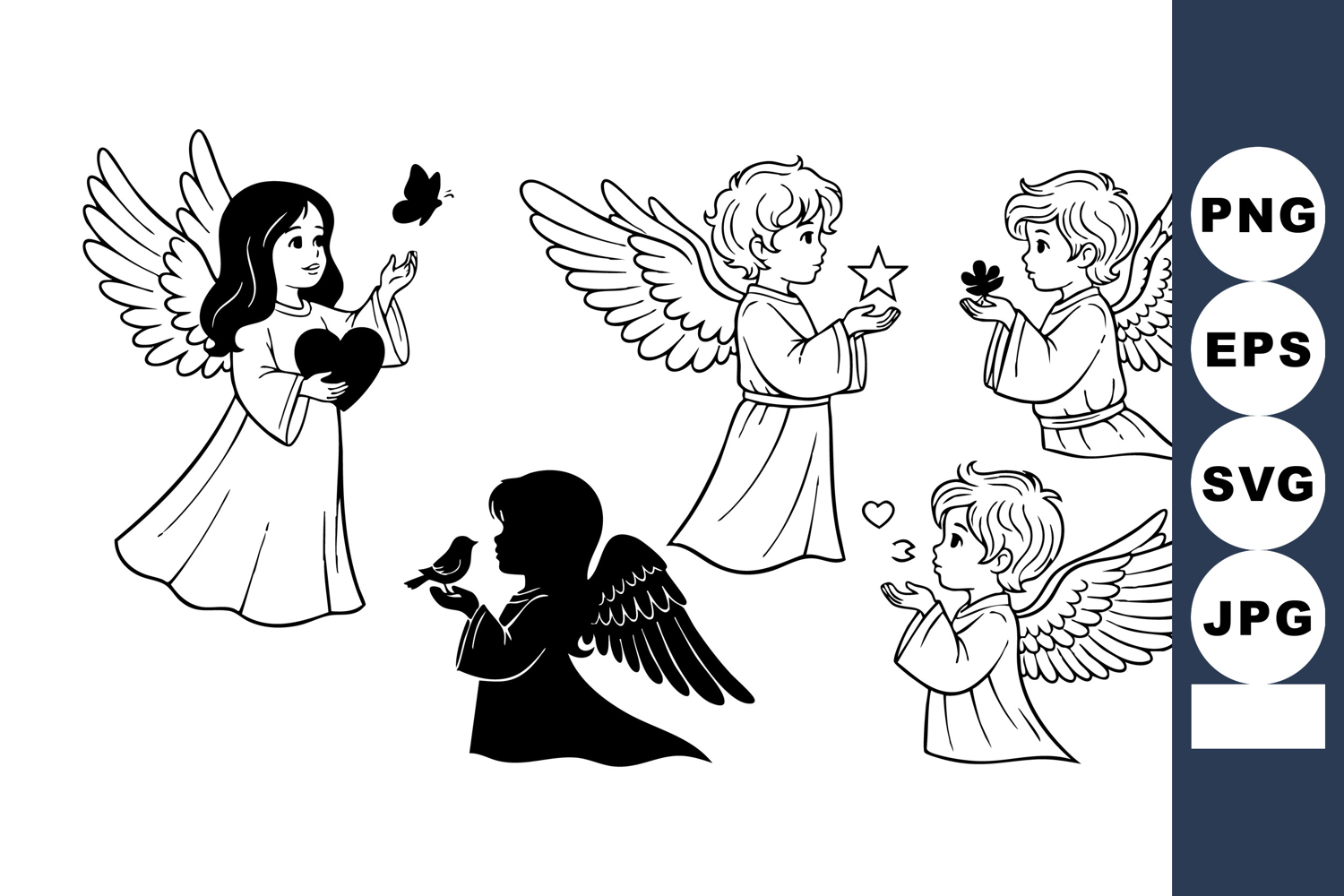 Adorable child angels appear in black and white cartoon line art, each cherub holding hearts, star, clover, butterfly or bird, ideal for coloring pages, greeting cards, spiritual children’s designs, sweet.