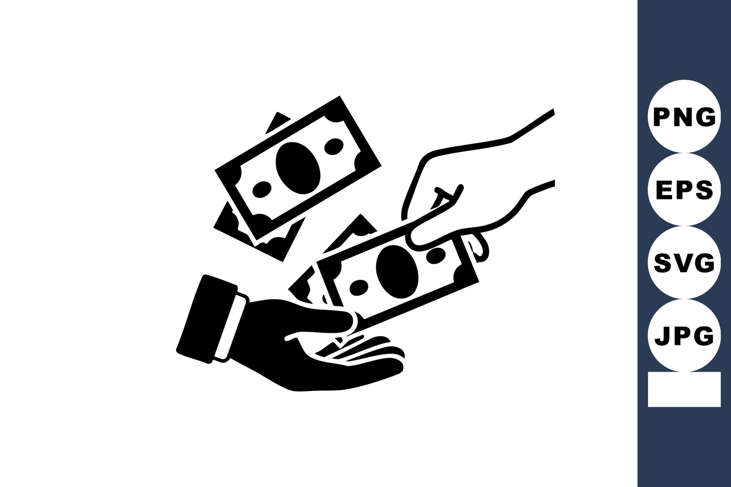 Bold monochrome icon depicts one hand giving cash bills to another open palm, with extra banknotes falling above, in flat design style for finance apps, infographics, and payment interfaces, professional.
