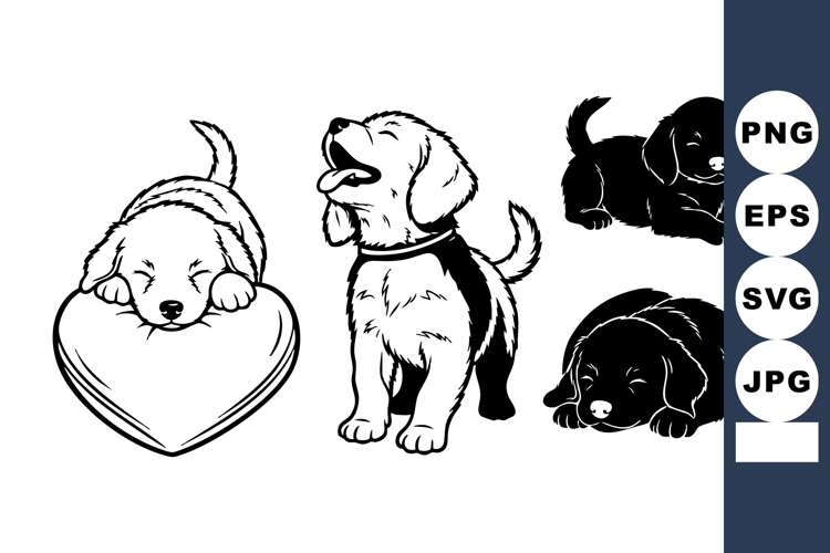 Adorable beagle puppies appear in multiple poses, including sleeping on a heart pillow and standing happily in bold black and white line art, ideal for coloring pages, stickers, and children’s pet designs, playful.