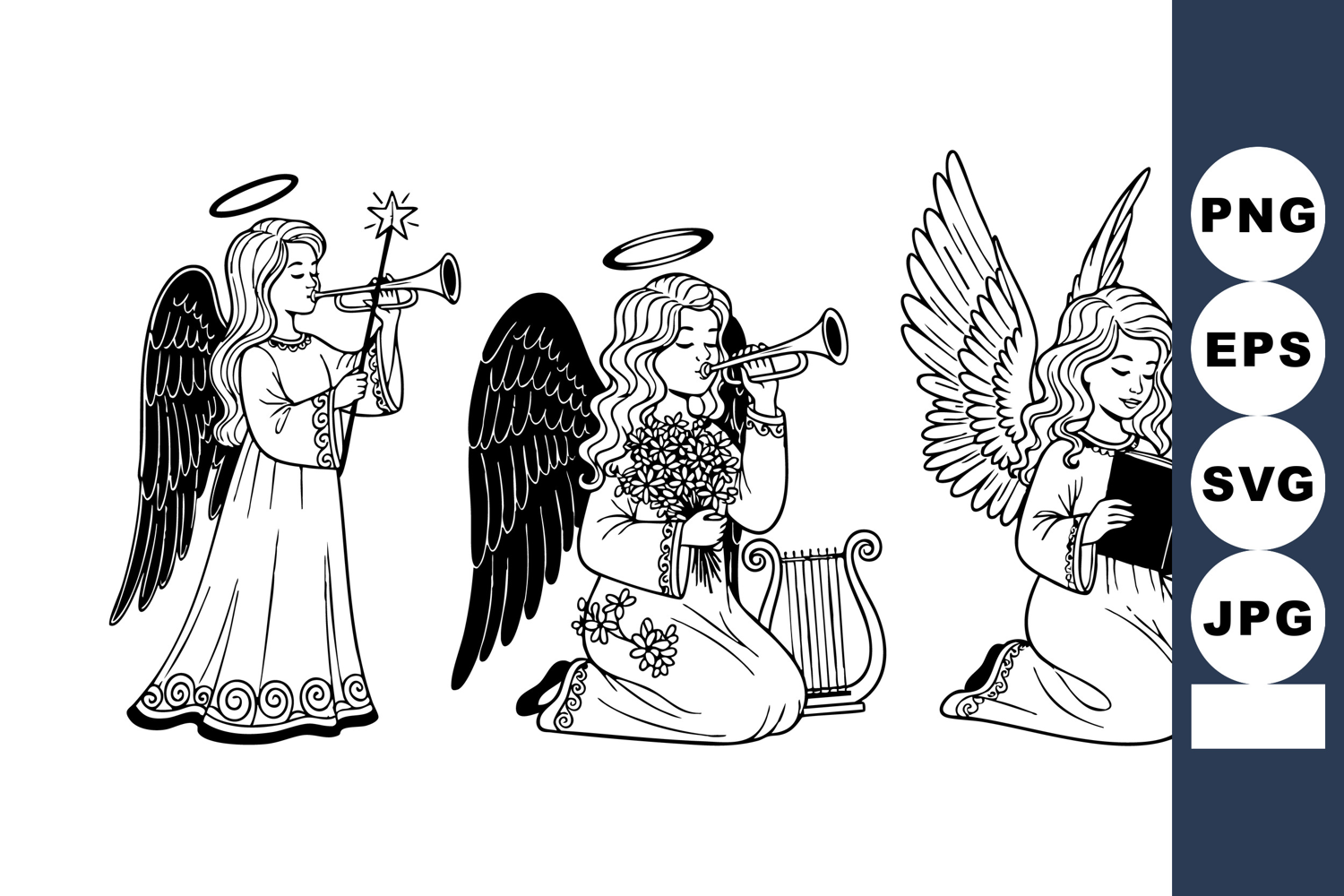 Christmas Greeting Card Christmas Angel Illustration Christian Holiday Art Guardian Angel Trio Black White Angels Line Art Angels Trumpet Playing Angel Angel Reading Book Feathered Wings Detail Church Bulletin Graphic