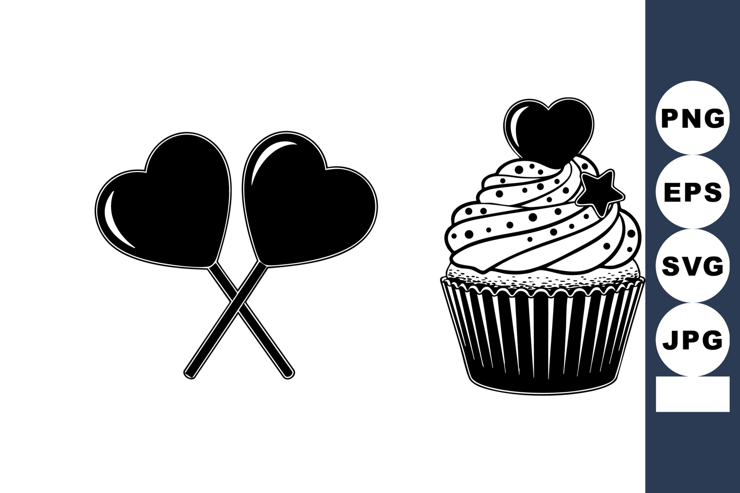 Black and white dessert artwork presents a frosted cupcake with heart and star decorations beside crossed heart lollipops, flat vector style suitable for valentine’s day cards, packaging, and bakery branding, romantic.