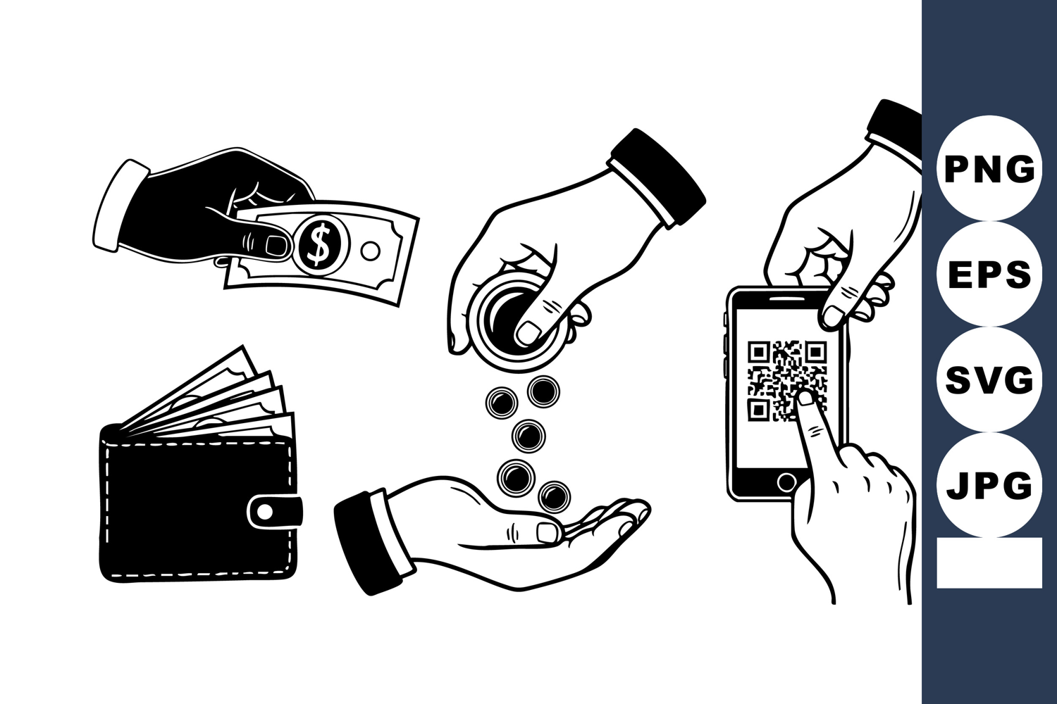 Black and white financial icon set illustrates wallet with cash, hand giving banknote, coins poured into palm, and smartphone qr code payment, suitable for fintech apps, infographics, and educational materials, modern.