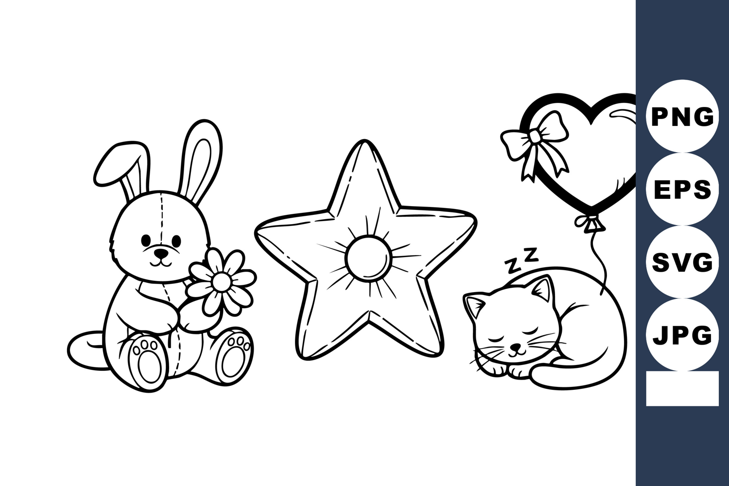 Playful black and white cartoon scene presents stuffed bunny with flower, chubby star, and sleeping kitten with heart balloon, drawn as clean line art coloring page for children activities and education, cheerful.