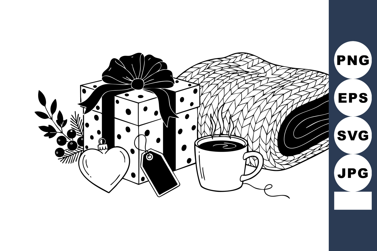 Line Art Christmas Steaming Coffee Mug Black White Outline Cozy Christmas Hygge Winter Hygge Scene Minimal Holiday Illustration Polka Dot Giftbox Knitted Blanket Drawing Festive Berries Foliage Heart Ornament Tag