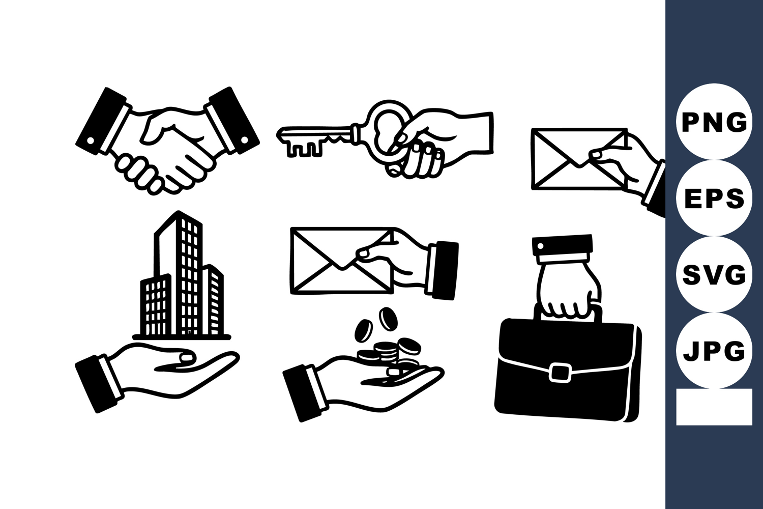 Clean black silhouette business icons display handshake agreement, real estate building, key and envelope , money payment, and briefcase, in flat vector style for corporate presentations, infographics, and web interfaces, professional.