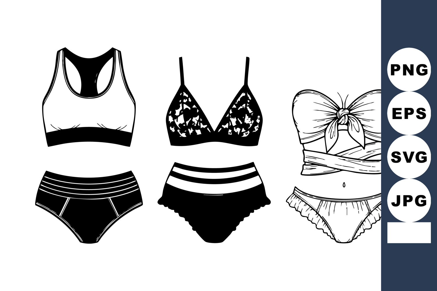Detailed black and white vector art displays three women’s bra styles with coordinating panties, including sporty, lace and bandeau designs, ideal for apparel catalogs, sewing patterns or lingerie branding, stylish.