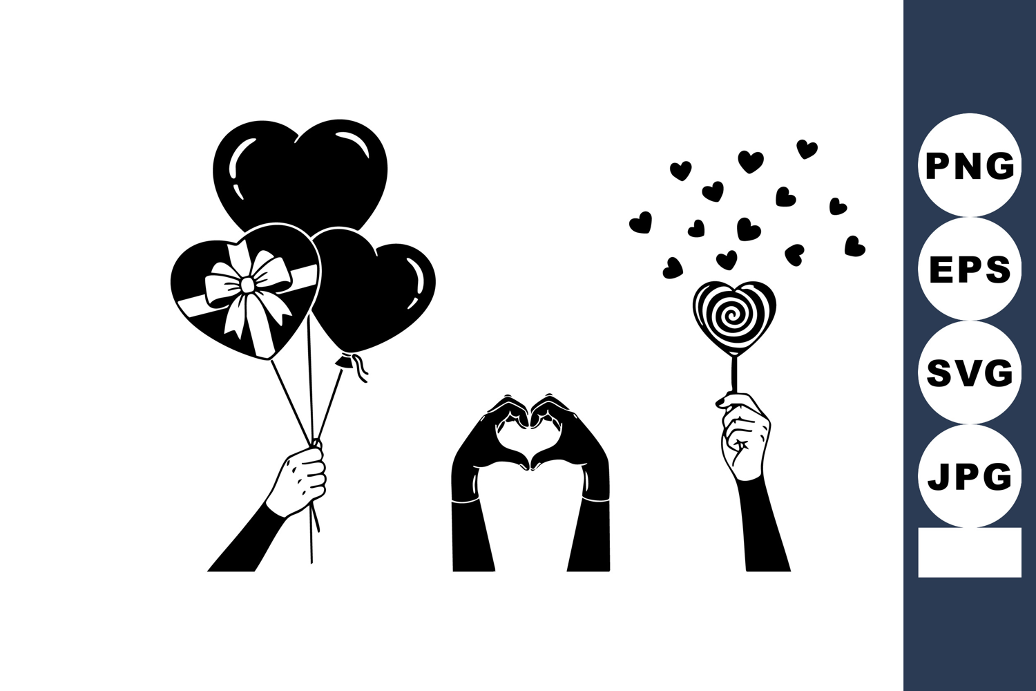 Stylized black and white Valentine’s Day vector art shows three separate hands with heart balloons, hand heart gesture, and spiral heart lollipop, ideal for greeting cards, posters, and social media, romantic.