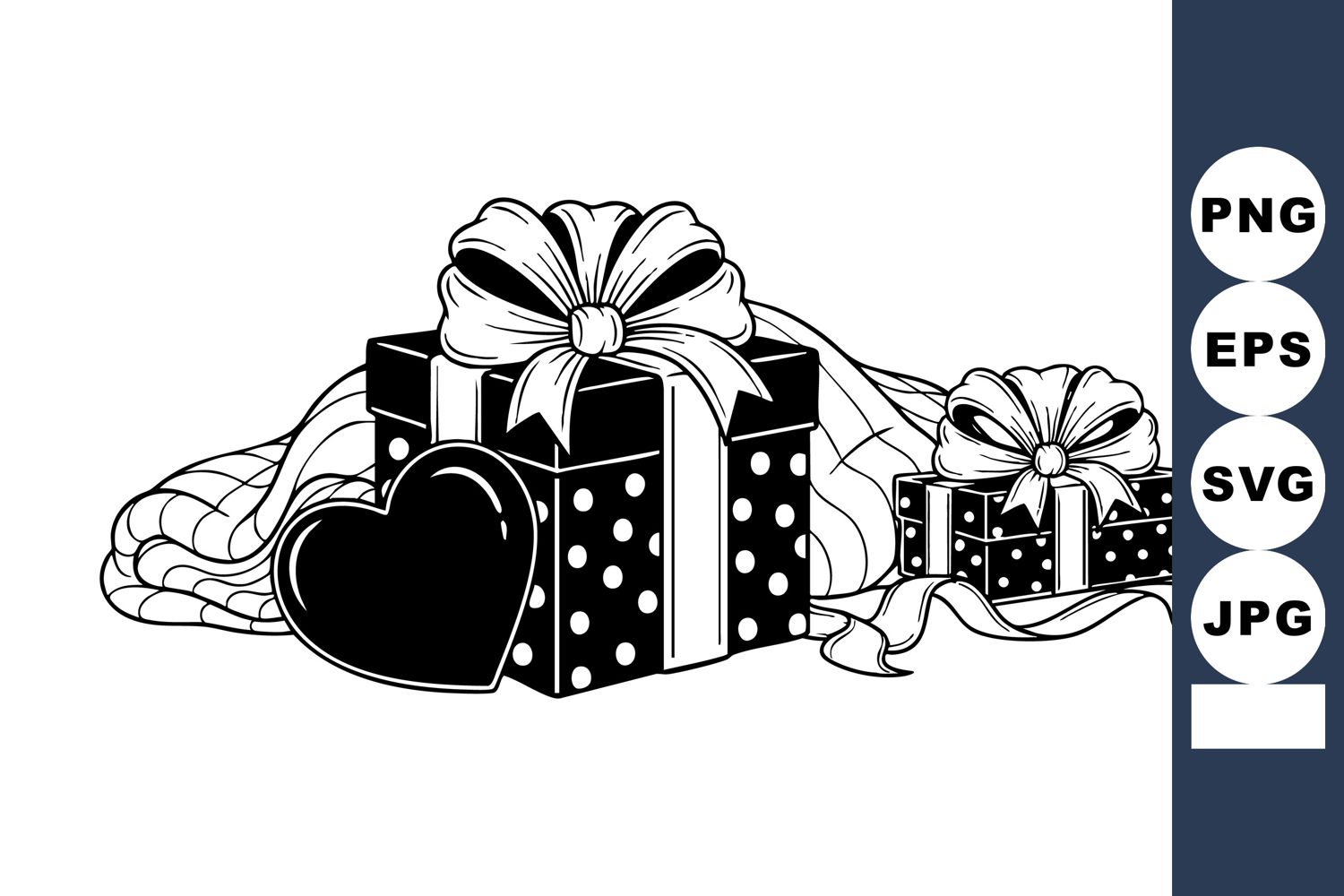 Elegant black and white vector art displays two polka dot gift boxes with ornate bows, heart emblem and draped ribbon, ideal for Valentine’s Day cards, wedding stationery, romantic packaging, sweet mood