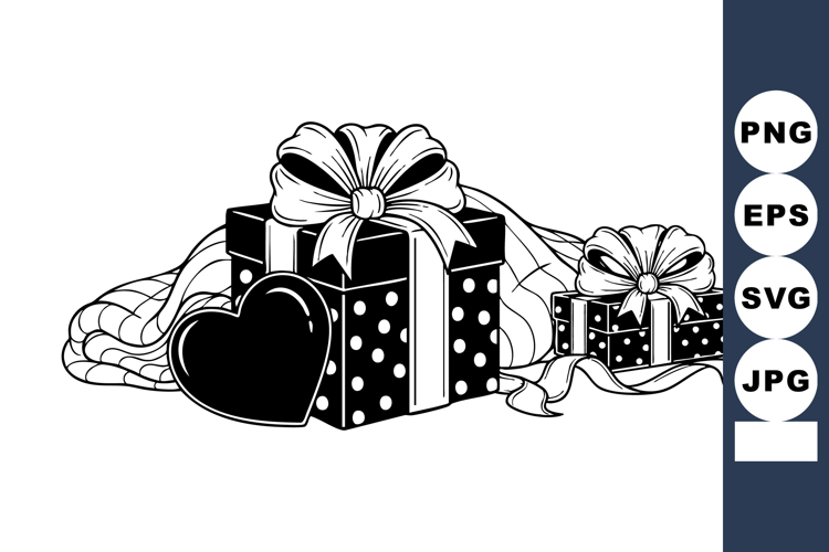 Valentines Day Illustration Wedding Gift Design Black White Clipart Romantic Greeting Card Line Art Coloring Romantic Gift Boxes Polka Dot Presents Heart Ribbon Composition Anniversary Present Art Valentine Packaging Design