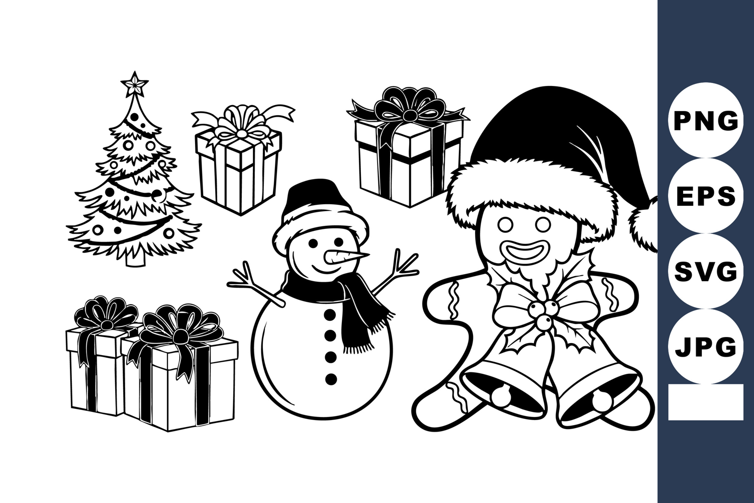 Playful Christmas line drawing displays cheerful snowman, gingerbread cookie character, ornamented tree and ribboned presents in simple cartoon vector art, ideal for children’s coloring sheets or holiday craft designs, joyful.