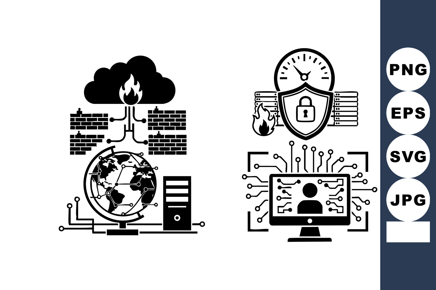 Stylized black and white vector art displays paired cybersecurity scenes with firewall cloud, globe, server stack, shield lock, and user monitor circuits, suitable for infographics, web dashboards, or technology presentations, modern.