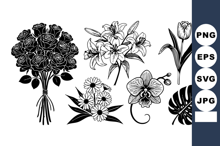 Elegant black and white floral vector art presents separate rose bouquet, lilies, tulip, daisies, orchid and monstera leaf in detailed tattoo style, suitable for stationery, packaging, or coloring pages, graceful.