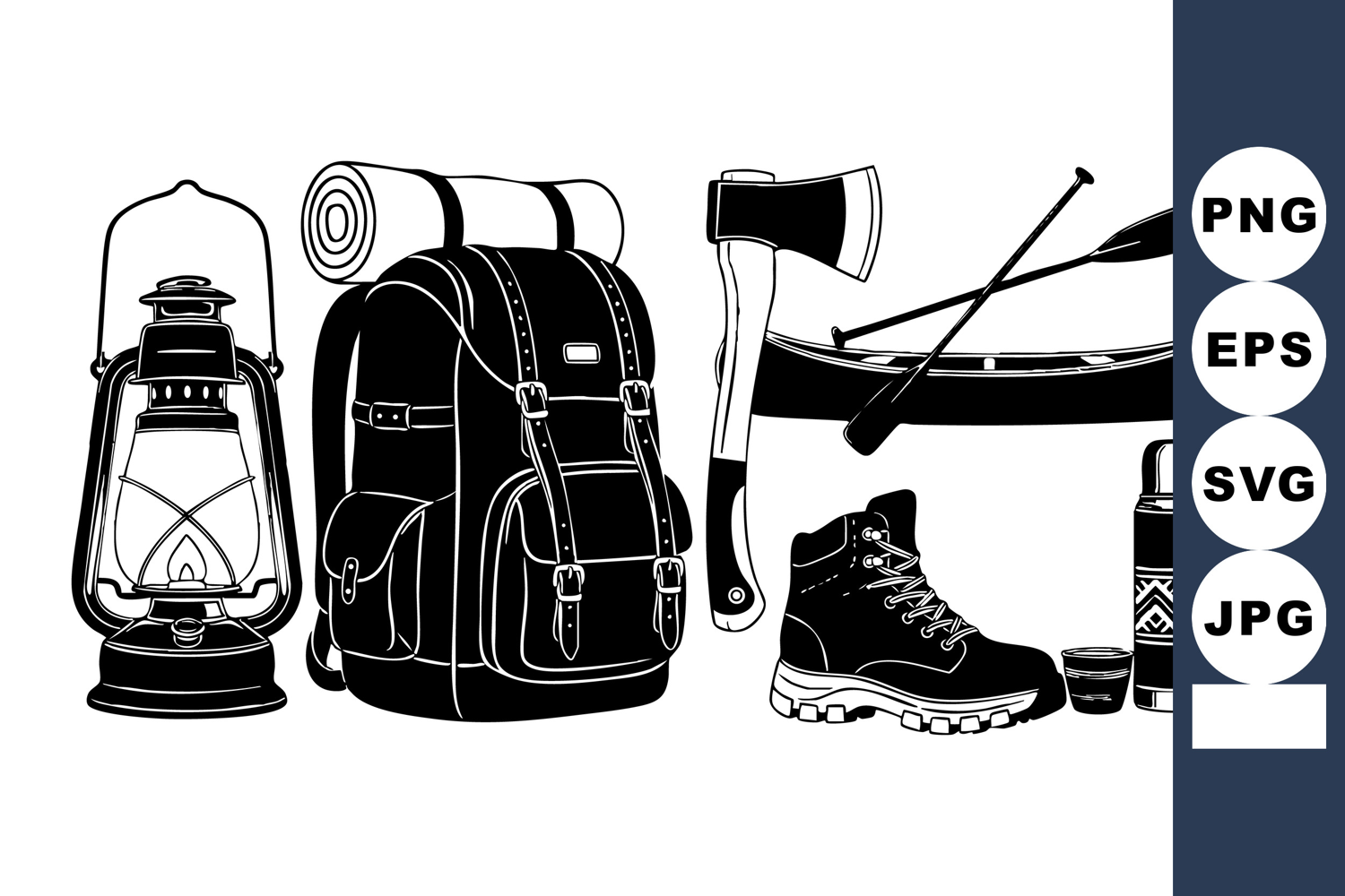 Black and white vector art arranges lantern, backpack, rolled mat, canoe with paddles, axe, hiking boot and patterned thermos, ideal for outdoor posters, adventure badges, web graphics, rugged mood.