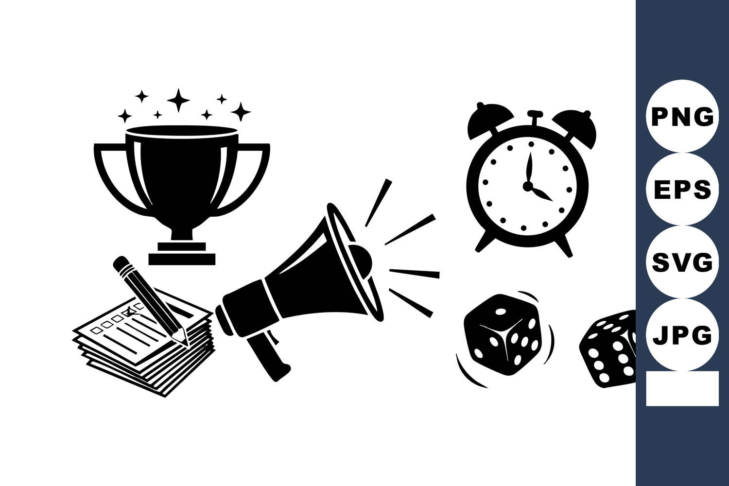 Bold monochrome icon collection presents trophy, survey documents, megaphone, ringing alarm clock and tumbling dice in flat vector art, ideal for games, contests, event branding and education materials, dynamic.