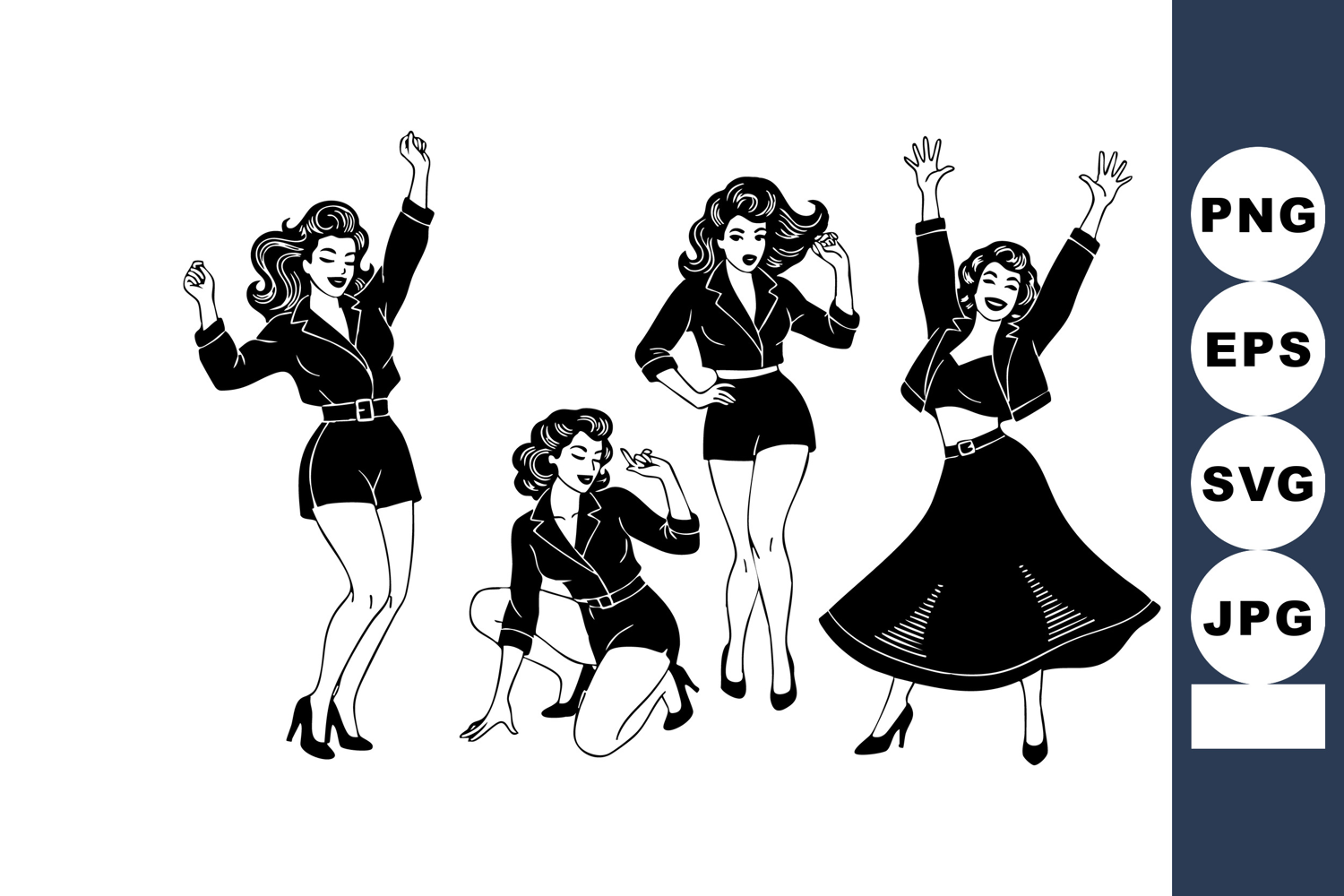 Energetic retro pin up characters show four stylish women dancing and posing in black outfits and heels, flat monochrome vector art ideal for posters, apparel prints, and nostalgic branding, cheerful.